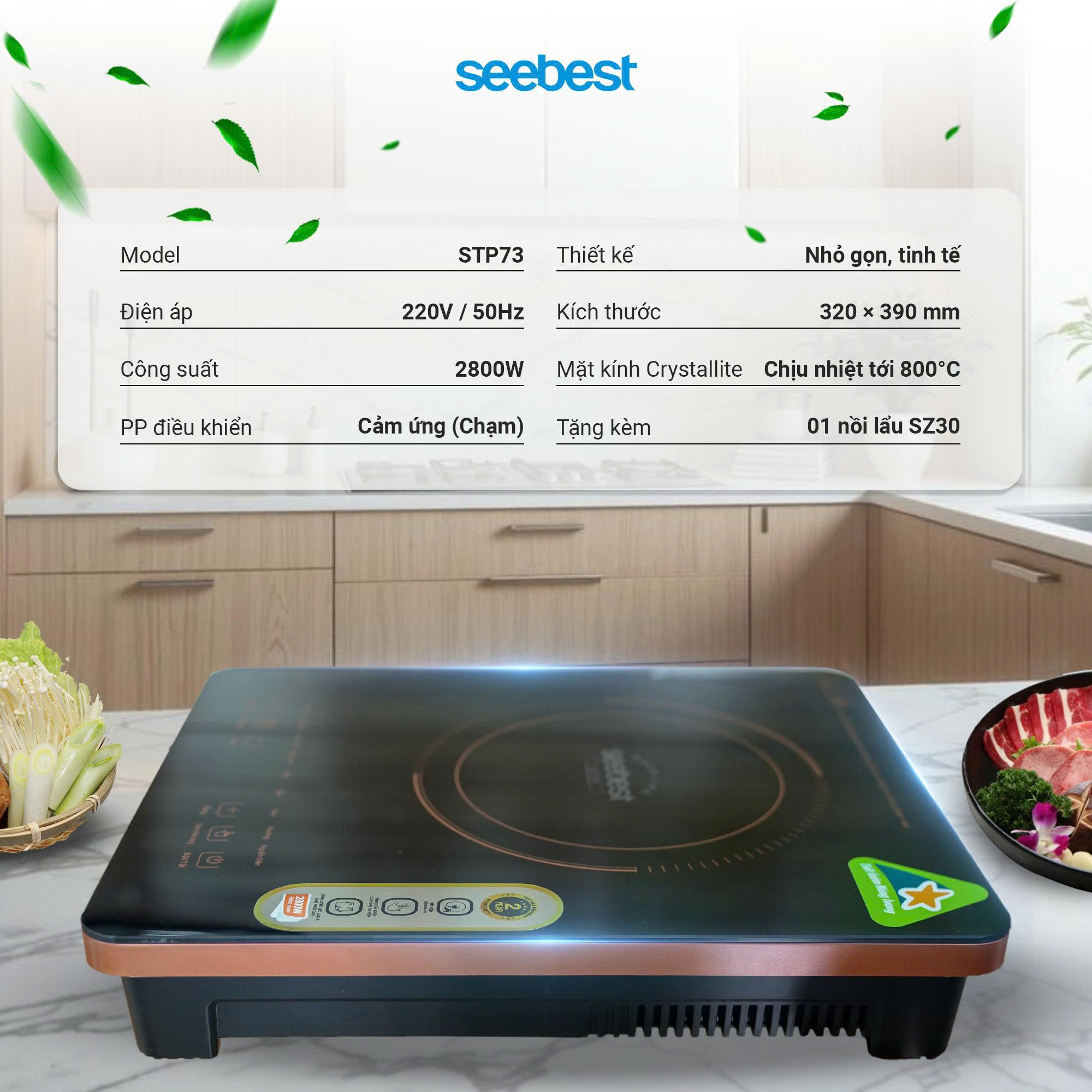 - Bếp từ đơn Seebest STP73 là mẫu bếp từ với thiết siêu mỏng, bo viền mang đến độ thẩm mỹ cao tăng thêm độ thẩm mỹ, sang trong cho không gian bếp của gia đình.